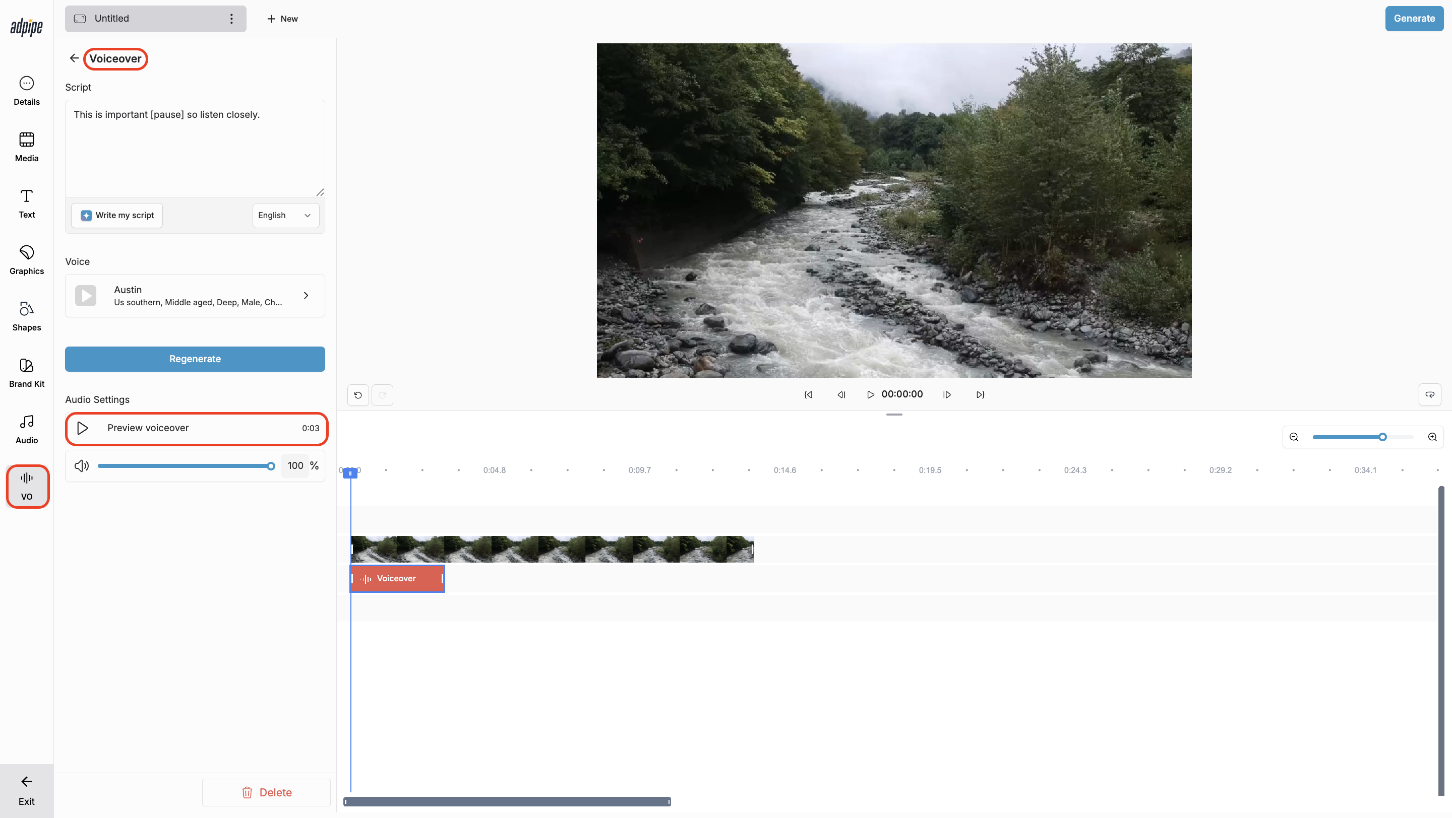 - In the editor, open Voiceover (see AI Voiceover article for setup).
