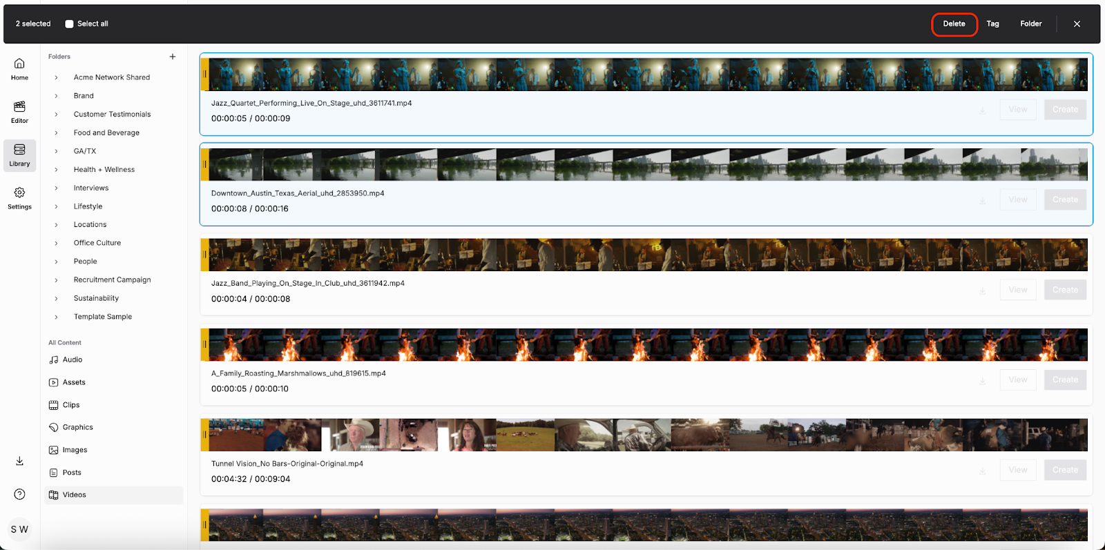 Deleting videos helps you keep your library clean and organized. You can remove multiple files at once using bulk delete, or delete items individually.