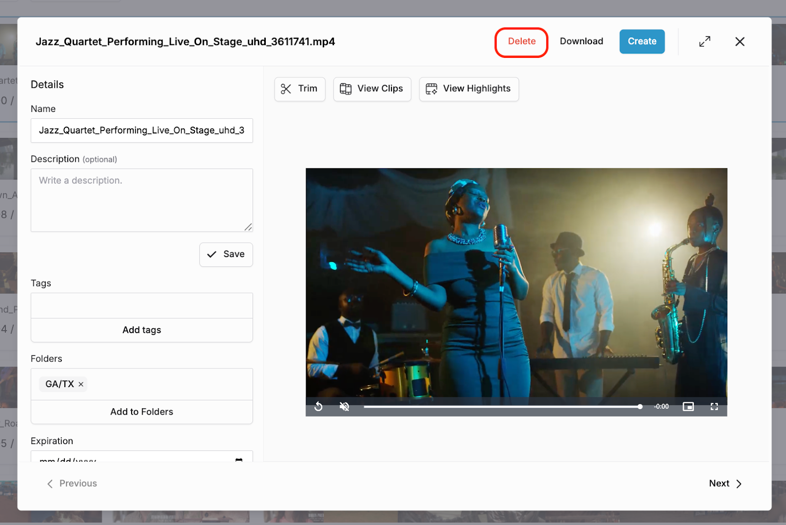 - Open the Asset, Clip, Video, Image, or Graphic you want to delete.