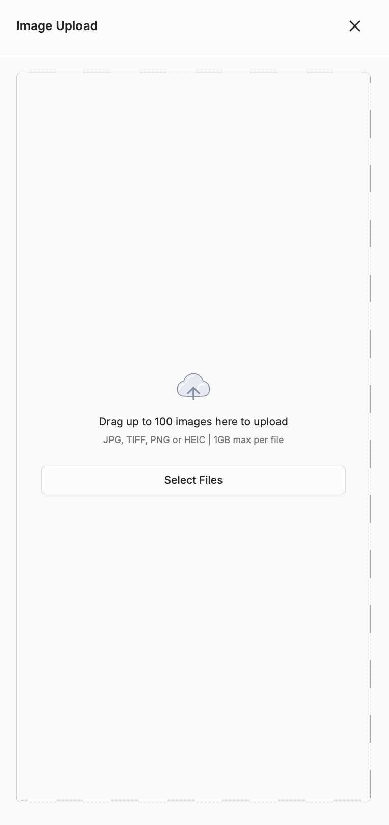 A window will appear where you can drag and drop up to 100 images or click Select File to browse and upload them from your computer. Once selected, your images will begin uploading automatically.